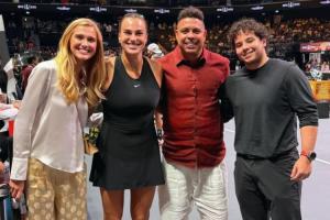 本場比賽,大羅和妻子塞琳娜現(xiàn)場觀戰(zhàn)比賽,大羅與薩巴倫卡、克耶高斯合影。
