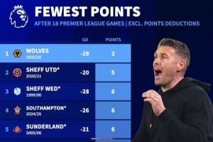 體育資訊12月29日訊 狼隊在本輪英超焦點戰(zhàn)1-2不敵利物浦,延續(xù)了本賽季的低迷表現(xiàn)。數(shù)據(jù)統(tǒng)計顯示,他們也創(chuàng)下了英超歷史前18輪同期最低積分。如果按照當前的拿分情況,他們將最終僅積4分,而英超歷史單賽季最低總積分為11分。