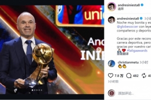 伊涅斯塔社媒曬出領(lǐng)獎的照片,配文:“度過了一個美好而特別的夜晚,與眾多傳奇、杰出伙伴和運動員們共聚一堂。”