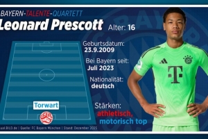 16歲門將萊昂納德·普雷斯科特身高已達(dá)1.96米,比諾伊爾還高兩厘米。他出生于紐約,但在柏林長大。2023年7月,他從柏林聯(lián)合轉(zhuǎn)會至拜仁,并憑借出色表現(xiàn)迅速接近一線隊(duì)。這位年輕的門將已經(jīng)開始與一線隊(duì)的門將教練邁克爾·雷納(45歲)和安德烈亞斯·羅塞爾(37歲)一起訓(xùn)練。