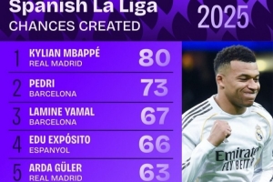 體育資訊12月30日訊 2025年即將結(jié)束,數(shù)據(jù)機構(gòu)squawka也統(tǒng)計了本年度西甲創(chuàng)造機會情況,姆巴佩力壓佩德里居首。