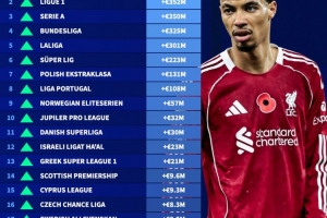 體育資訊12月31日訊 德轉(zhuǎn)統(tǒng)計(jì)了2025年歐洲聯(lián)賽整體的身價(jià)上漲和跌幅排行榜,英超斷層領(lǐng)先排名榜首。