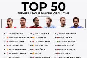 體育資訊12月31日訊 近日,知名體育媒體《體育畫(huà)報(bào)》公布了英超歷史50大球星,其中亨利第一,C羅第2,薩拉赫第6。