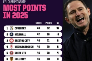 體育資訊12月31日訊 數(shù)據(jù)網(wǎng)站OPTA盤點了2025全年英冠積分榜,其中蘭帕德率領(lǐng)的考文垂積分92分,比排在次席的米爾沃爾多出16分,凈勝球更是高達(dá)37球。