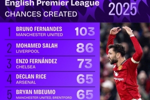 體育資訊1月1日訊 Squawka統(tǒng)計2025年英超球員創(chuàng)造機(jī)會榜,B費(fèi)103次居首,薩拉赫第二,恩佐第三。