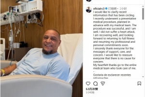 卡洛斯曬出自己在醫(yī)院的照片,并配文寫道:“我想澄清一下最近流傳的一些信息,我最近接受了一項(xiàng)預(yù)防性醫(yī)療程序,這項(xiàng)程序是事先與我的醫(yī)療團(tuán)隊(duì)商定的。程序很成功,我目前身體狀況良好,沒(méi)有心臟病發(fā)作。”