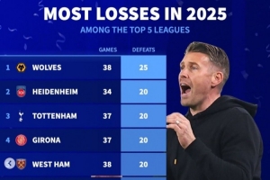 體育資訊1月1日訊 2025年已經(jīng)結(jié)束,《轉(zhuǎn)會市場》也統(tǒng)計了本年度五大聯(lián)賽輸球場次最多情況,前五有3支英超球隊。