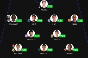 前衛(wèi):揚(yáng)·迪奧曼德(萊加內(nèi)斯、萊比錫,7.37分)、杜埃(巴黎,7.40分)、帕斯(科莫,7.34分)、亞馬爾(巴薩,7.81分)