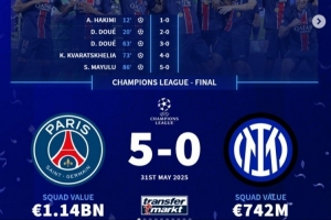 歐冠決賽:巴黎5-0國米