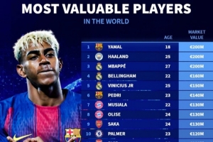 體育資訊1月1日訊 2025年已經(jīng)結(jié)束,《轉(zhuǎn)會市場》也列出了當(dāng)前全球身價榜前二十的球員,亞馬爾、哈蘭德和姆巴佩均2億歐最高。