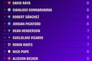 體育資訊1月2日訊 Squawka統(tǒng)計(jì)了本賽季的英超零封榜,阿森納門將拉亞第一。