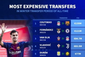 體育資訊1月3日訊 德國轉(zhuǎn)會(huì)市場列出冬窗最貴轉(zhuǎn)會(huì)排名,庫蒂尼奧1.35億歐居首。