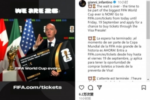 體育資訊9月11日訊 國際足聯主席因凡蒂諾更新社媒動態(tài),宣布世界杯球票銷售即將開始。