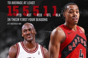 生涯前四季,斯科蒂-巴恩斯場均17.2分7.5籃板5助攻1.2搶斷1蓋帽;喬丹前四季場均32.7分5.6籃板5.3助攻2.8搶斷1.3蓋帽。