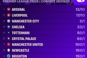 體育資訊09月29日訊 本輪英超,阿森納2-1逆轉(zhuǎn)絕殺紐卡斯爾聯(lián),賽后有關機構更新了英超冠軍的賠率。