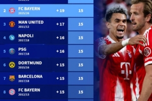 2、拜仁2025/26賽季15分19個(gè)凈勝球