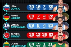 4場(chǎng)對(duì)決結(jié)束后,歐錦賽官推曬出了8強(qiáng)戰(zhàn)中的球員高光表現(xiàn):