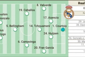 據《阿斯報》預測首發(fā)為:庫爾圖瓦;巴爾韋德、勞爾-阿森西奧、赫伊森、弗蘭-加西亞;瓊阿梅尼、卡馬文加、塞巴略斯、貝林厄姆;迪亞斯或貢薩洛、維尼修斯或羅德里戈。