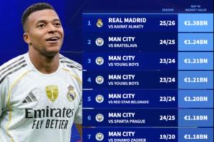 歐冠歷史身價差距最大比賽排行↓(本賽季阿森納對陣凱拉特交鋒也將躋身榜單,但由于球員身價將在后續(xù)更新中調(diào)整,故暫未列入本次統(tǒng)計)
