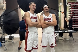 體育資訊9月30日訊 熱火官方社媒曬出了媒體日上約維奇和哈克斯的合影。從照片中可以看到,哈克斯一直踮著腳,想要減少和約維奇的身高劣勢。