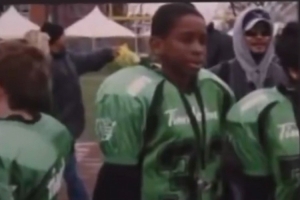 隨后主持人拿出了亞歷山大小時候打橄欖球的照片(配圖)。亞歷山大隨后說:“(打橄欖球)沒門兒、沒門兒,我倒在了橄欖球場、被風吹倒了,所以我馬上就沒打了。”