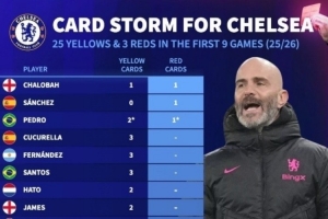 黃牌方面,庫庫雷利亞、恩佐和桑托斯是隊內(nèi)得牌最多的球員,均為3張。哈托、里斯-詹姆斯和喬治則各有2張黃牌入賬。此外,包括查洛巴在內(nèi)的七名球員各領(lǐng)到1張黃牌。