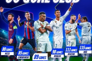 歐冠官方也盤點了歷史上打進(jìn)歐冠60球最快用時場次榜,具體如下: