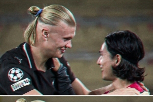 哈蘭德與南野拓實擁抱寒暄,此役哈蘭德為曼城打進2球,而效力于摩納哥的南野拓實擔任替補未能出場。