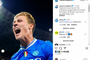 霍伊倫社媒曬出比賽照片,并寫道:“霍伊倫在歐冠比賽中梅開二度,還都是德布勞內(nèi)的助攻——這完全不在我2025年的劇本之中?!?/p>
