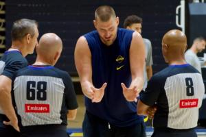 在對(duì)抗賽結(jié)束之后,約基奇拉著三位裁判討論判罰的具體細(xì)節(jié),記者稱,約基奇拉著三位裁判問了大約20分鐘。