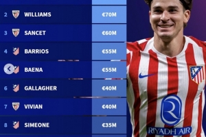 西甲非皇馬巴薩球員身價前十(單位歐元):