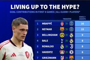 該榜單具體排名如下↓(只統(tǒng)計轉會費>1億歐元的攻擊手,數(shù)據(jù)為進球+助攻)