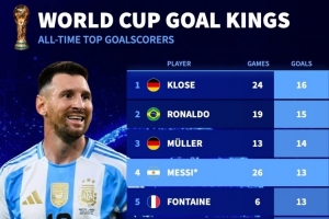 體育資訊10月4日訊 2026年世界杯用球“三重浪”發(fā)布,德國轉(zhuǎn)會(huì)市場列出了世界杯歷史射手榜,前十名中有兩名現(xiàn)役球員——梅西和姆巴佩。