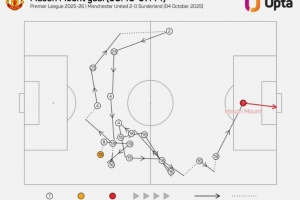 據統(tǒng)計,芒特進球前經過18次傳球,這是本賽季英超進球中最多,而曼聯(lián)上一次進球前有如此多傳球還在2023年9月(B費進球)。