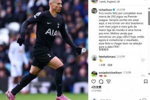 體育資訊10月4日訊 在本輪英超,熱刺2-1擊敗利茲聯,理查利森替補登場完成英超第250次出場。