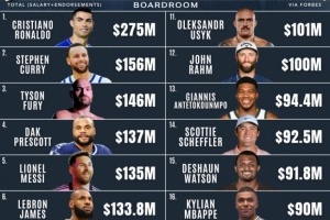 體育資訊10月6日訊 今天,美媒BoardRoom轉(zhuǎn)載了世界范圍內(nèi)收入(工資+代言)最高的運動員排名,這份榜單最早發(fā)布于今年5月。