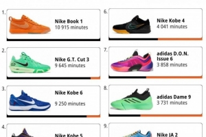 體育資訊9月12日訊 本賽季W(wǎng)NBA常規(guī)賽已全部結(jié)束,球鞋媒體Kixstats統(tǒng)計(jì)了本賽季單一款式球鞋上腳時(shí)間的TOP10排行,還有品牌上腳時(shí)間排行TOP10。