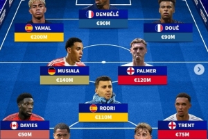 前鋒:亞馬爾(西班牙,2億歐元)、登貝萊(法國(guó),9000萬歐元)、杜埃(法國(guó),9000萬歐元)