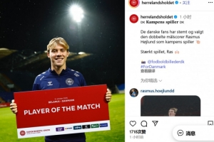 體育資訊10月10日訊 丹麥國(guó)家隊(duì)官方宣布,霍伊倫當(dāng)選6-0白俄羅斯的球迷票選最佳球員。