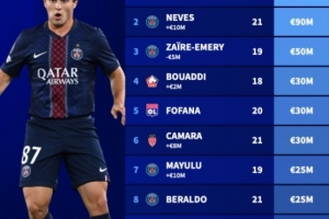 1、杜埃(20歲,巴黎圣日耳曼):9000萬歐元