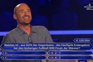 體育資訊10月11日訊 在德國版的《誰想成為百萬富翁》智力競(jìng)賽節(jié)目中,一位參賽者沒能回答對(duì)世界杯決賽的比分,錯(cuò)失12.5萬歐元(約103萬人民幣)獎(jiǎng)金。