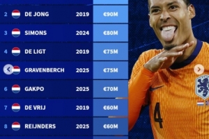 體育資訊10月13日訊 德國轉(zhuǎn)會市場盤點了荷蘭球員歷史身價榜,范迪克以1億歐元居首,弗蘭基-德容以9000萬歐位居次席。