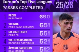 體育資訊10月17日訊 Squawka統(tǒng)計(jì)了本賽季到目前為止歐洲五大聯(lián)賽球員傳球次數(shù)排行,巴薩中場佩德里完成690次傳球位居榜首,巴黎中場維蒂尼亞651次排在第二位。