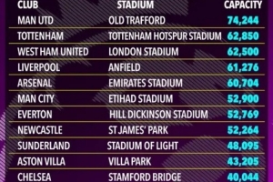 體育資訊10月17日訊 《太陽(yáng)報(bào)》對(duì)比上個(gè)賽季和本賽季的英超手冊(cè),發(fā)現(xiàn)有五支英超俱樂部的球場(chǎng)容量較上賽季有所變化。