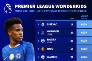 體育資訊10月18日訊 德轉(zhuǎn)在北京時間本月17日更新英超球員身價,同時列出了英超U21球員身價榜,埃斯特旺、亞當(dāng)-沃頓、巴萊巴三人6000萬歐身價最高。