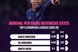 數(shù)據(jù)統(tǒng)計(jì)顯示,阿森納本賽季5項(xiàng)防守端關(guān)鍵數(shù)據(jù)均位列英超前二: