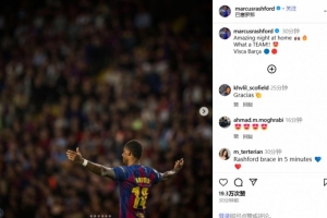 在社交媒體上,拉什福德慶祝了本場(chǎng)比賽的勝利,他寫道:精彩的主場(chǎng)之夜,多么棒的一支球隊(duì)!加油巴薩!