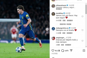 馬競前鋒阿爾瓦雷斯此役踢滿全場,賽后他在社交媒體上曬出比賽照片,配文:“抬起頭,繼續(xù)前進(jìn)?!?/p>
