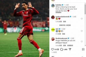 ?;倏斯テ评蠔|家球門后沒有慶祝,他在社交媒體上曬出比賽照片,配文:“能夠回到這里真是太好了(上天的恩賜),感謝你們的愛,祝一切順利?!?/p>