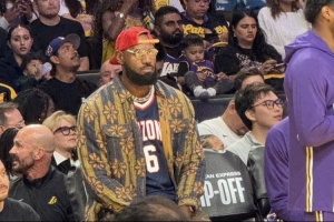 據(jù)現(xiàn)場(chǎng)記者Dan Woike分享的照片,本場(chǎng)因傷缺陣的詹姆斯身穿小兒子布萊斯在亞利桑那大學(xué)的球衣到場(chǎng)觀賽。